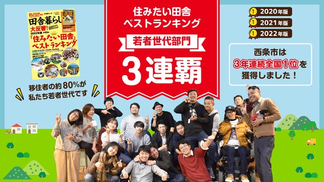 愛媛県西条市は、株式会社宝島社が発行する『田舎暮らしの本』(2022年2月号)で発表された「2022年版 住みたい田舎ベストランキング」若者世代部門において、全国1位を獲得しました。若者世代が住みたい田舎部門は2020年、2021年に引き続き全国1位となり、3連覇を達成しました。コロナ禍でも移住者が増加傾向にあり、その約8割を若者世代が占めています。