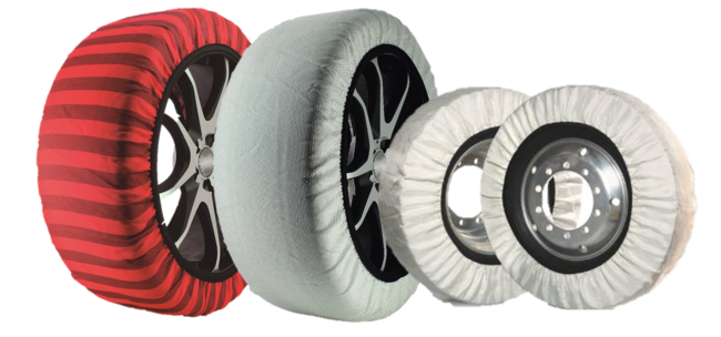 わずか6サイズで、軽自動車で使われる幅の狭いタイヤからSUVの大口径タイヤまで、市販されているほぼ全てのタイヤで装着可能。また大型車両用に対応する唯一の布製タイヤチェーンでもあります(大型車両用のサイズ展開は14サイズ)。