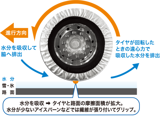 タイヤが雪に接すると瞬間的に雪が溶けて水の膜が発生します。この水分がスリップの原因となります。イッセ・スノーソックスの表面は糸が立体的に編み込まれ、大変に厚みのある作りになっています。これが水分をしっかりと吸収・排出するため、タイヤと路面の摩擦面積が広がり確かなグリップを生み出します。水分の多い雪道や、シャーベット状になりやすい都心の路面でも安心して走行できるのはこのためです。
