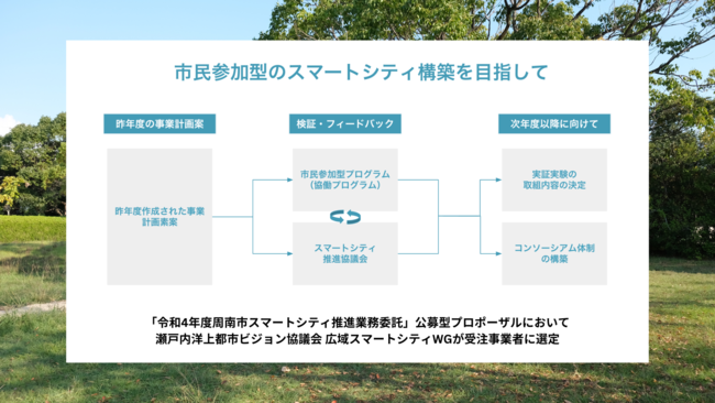 2年目にあたる今年度は、昨年度モデル地区として選定された周陽・遠石地区を中心に、モデル地区住民や学生、関係者等がデジタル技術やデータを活用したまちづくりに参画するためのプログラム(市民参加型プログラム・スマートシティ推進協議会)の企画・運営を行います。また、プログラムを通して得られたモデル地区住民や学生、関係者等からのフィードバックをもとに昨年度企画立案された事業計画案をブラッシュアップし、次年度以降に実施する実証実験の取組内容を作成します。