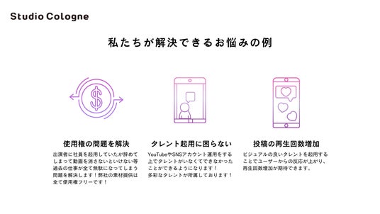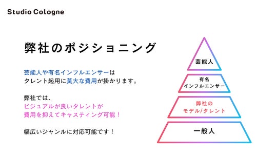 上記のような課題を解決するためにビジュアルの良いタレントを定期出演者として安価に起用していただけるSNS案件特化方のタレントキャスティング事業をリリースいたしました。