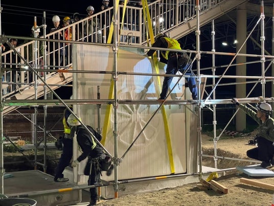 2025年3月25日午後11時57分の最終列車出発後にJR側で線路に列車が進入しないようにする手続きを実施した後、作業を開始。駅前ロータリーにパーツを積んだ合計4台のトラックを順番に入れ、荷台からパーツをクレーン車で吊り上げ、直接建築場所に設置しました。