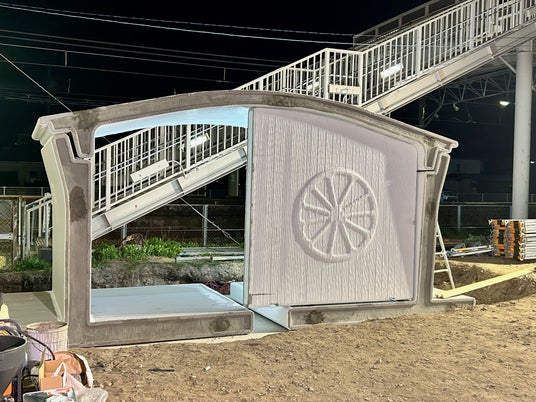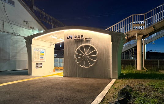 初島駅新駅舎(2025年7月22日撮影)意匠設計:株式会社ヌーブ一級建築士事務所 太田浩史一級建築士、西日本旅客鉄道株式会社大阪一級建築士事務所構造設計:株式会社KAP一級建築士事務所、西日本旅客鉄道株式会社大阪一級建築士事務所施工協力:合同会社芳輝建築 3Dプリント協力:立尾電設株式会社