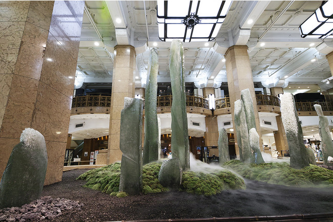 重要文化財 日本橋高島屋1階正面 ホールに出現した、リサイクルびんから生まれたオブジェが屹立するアート空間「一瞬に煌めく永遠 ガラスアートの瞑想空間へ」(2017 年)