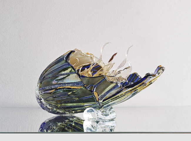 西中は、役割を終えたガラス製品にその記憶を留めたカタチで新しい命を吹き込み、 「再生と永遠の循環」を表現する作品を創作している。