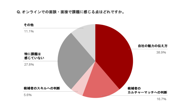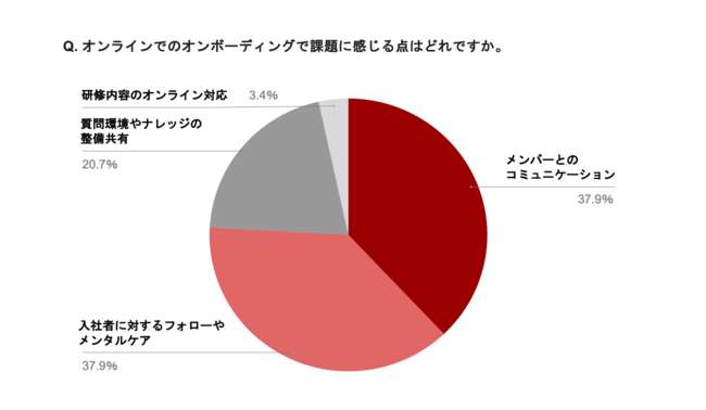 具体的には、入社者と他のメンバーとの関係構築やコミュニケーションに関する課題が多く、チャット上で質問しやすい状態をつくったり、同期を意識したコミュニティーを構築したり、1on1や面談でのケアにいっそう注力したりと、オンライン上でいかにフォローできるかが鍵であり、各社がさまざまな取り組みを実施していることがわかりました。