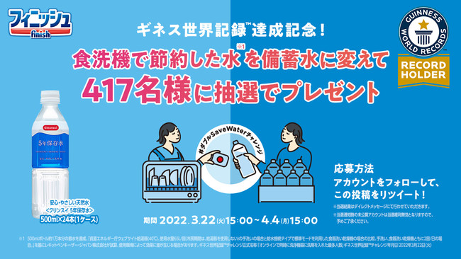 この記録達成と同様に100名が食洗機を利用した場合に節約できる水は500mlボトル約1万本分※2。フィニッシュでは、ギネス世界記録™認定を記念し、チャレンジで節約できた分と同量の水を防災用備蓄水としてプレゼントするTwitterキャンペーンを実施します。クリンスイ5年保存水を抽選で417名(合計約10,000本分)にプレゼントいたします。