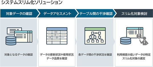 社内システムの更改に際し、現行システムの機能整理が不十分だったことから、新システムが必要以上に肥大化し開発コスト、及びその後の管理コストが膨れ上がる問題が生じています。これらの問題を解決するために、本サービスでは業務の作業証跡であるデータに着目し、システムが管理する実データの使用頻度やデータの構造を分析することで、不価値化しているデータを可視化し、システムスリム化対象の選定・検討に資するエビデンスを提供します。これにより、不価値化しているデータを用いた機能、データベース容量の圧縮に寄与することができ、システムリソース、及びそれに伴うシステム保守コストの最適化に繋げることを可能にします。NTTデータ バリュー・エンジニアが蓄積したデータマネジメントに関する知見をベースに実施するため、最短1ヶ月・50万円~と手軽に実施することができます。