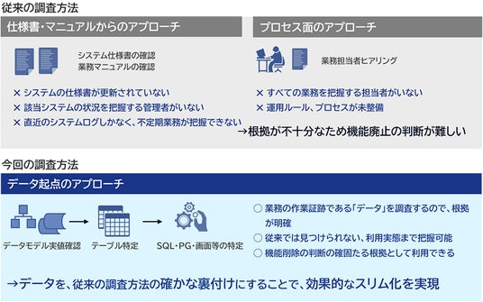 システム仕様書、業務マニュアルといったドキュメントをもとにした調査アプローチや、担当者ヒヤリングによる業務利用実態といったプロセス面だけの調査では、機能削除による業務への影響が不明確で、何を削除し、何を残すべきかという判断が難しくなります。そこで、NTTデータ バリュー・エンジニアが推奨するデータ観点のアプローチを加えると、データが長期にわたる業務の作業証跡となるので、アプリケーション・機能によるアプローチやプロセス面の調査では見つけられない利用実態まで把握することができ、機能削除の判断を行うための確かな根拠として利用するこができます。
