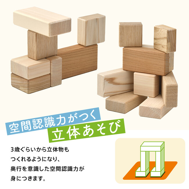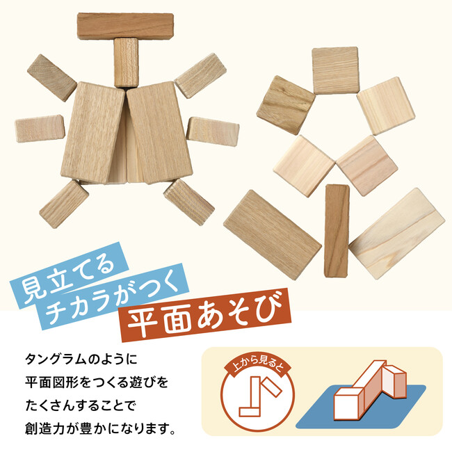 複数の保育園から4cm基尺の積み木の製造依頼があったことがきっかけに、子ども達の積み木遊びを観察。積み上げる以前の発達段階として、子ども達が「並べる」遊びをすることから、並べながら“描く”「平面あそび」を開発し、遊びの発展を促す作例をガイドブックとして保育園に提供しました。3歳以降は「積み上げる」ことも容易になるため、「立体あそび」として作例に。このガイドブックは、保育士が1対1で子どもと向き合った時に遊びのサポートにもつながったことから、この度、ガイドブックと積み木をセットにした親子向けの商品として発売いたします。