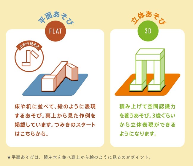 絵を描くように並べて遊ぶ平面あそびと、積み上げられるようになってからの立体あそび。発達に応じたあそび方ガイドで、保護者をサポートしながら、子どもの創造性を育む。