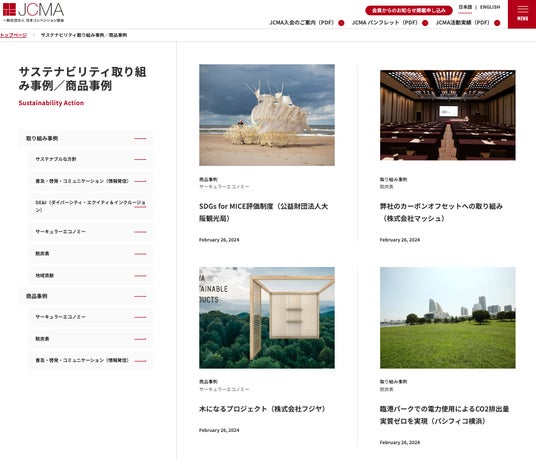 一般社団法人日本コンベンション協会(Japan Convention Management Association(以下、JCMA))は、2024年3月4日(月)、会員各社のサステナビリティに関する33の取り組み事例や商品事例を当協会ホームページにて公開しました。会員企業はもとより、MICE業界全体のサステナビリティへの取り組みを支援できるよう、引き続き各社の取り組みや商品事例を追加・更新してまいります。