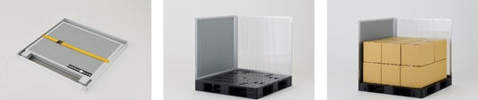 軽量化により、1 人30 秒~1 分で組立可能とし、作業者の負担を軽減、作業を効率化します。パレットに置くだけで簡単に組み立てられ、保管庫としても使用できるため、2 段積みした状態のままフォークリフトでラックに積むことも可能です。