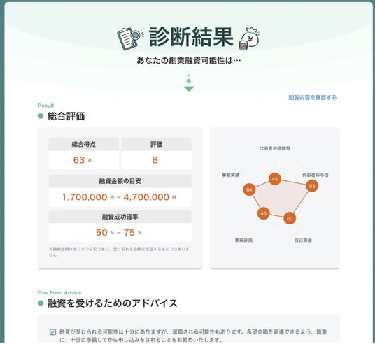 本連携により共同開発した「創業融資額診断シミュレーション」は、創業期の融資の成功確率や金額のめやす、利用できる制度の候補や留意点が5分でわかるサービスとしてSoVaよりサービスの提供を開始いたします。