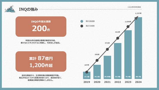 INQは、特に創業期の経営者様を対象に累計1,200件87億円超(※)の融資を支援してまいりました。
