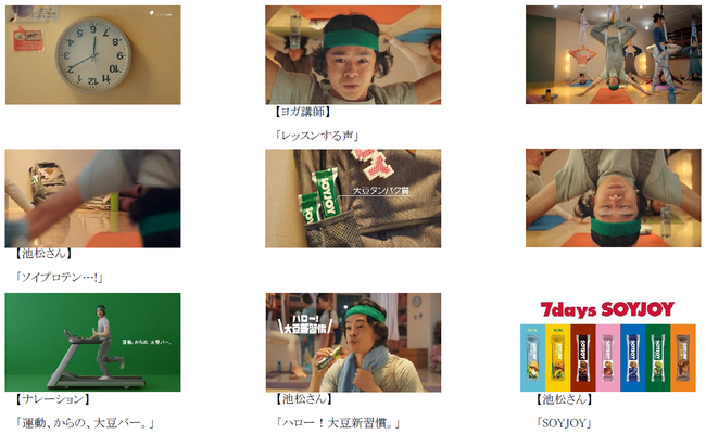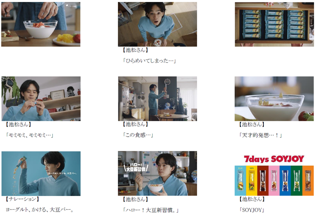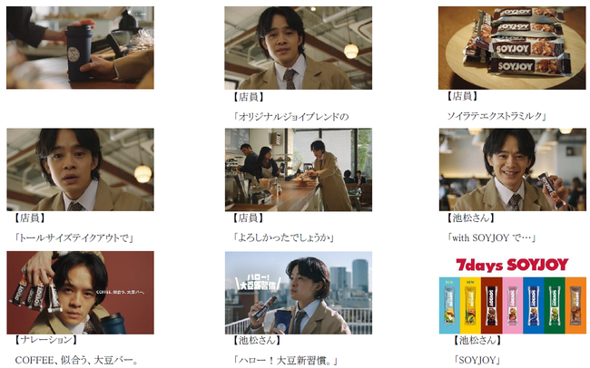 本CM3本には俳優の池松壮亮さんが出演。栄養豊富な大豆をまるごと使用したSOYJOYを毎日食べて健康的な間食習慣を後押しする「7days SOYJOY」にあわせ、カフェでの休憩やワーケーション、運動の合間や夜の小腹が空いた時など、日常でSOYJOYを取り入れた7つのシチュエーションが描かれています。時にはコミカルに、時には真剣な表情でそれぞれのシチュエーションを演じ分けた池松さんの表現力は必見です。
