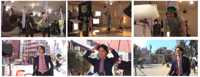 緑色のヘッドバンドとヨガウエアで現場入りした池松さん。まずCM撮影前にインストラクターからエアリアルヨガのポーズを指導されました。ハンモックに座る際にバランスをとるのが難しく、周りのスタッフやインストラクターが転ばないかと心配そうに見守る中、池松さんは持ち前のバランス感覚の良さと運動神経を活かし、1発でポーズをとることに成功。インストラクターも「初めての人には難しいのに…!」と驚いて拍手をし、本人もホッと安心した様子でした。