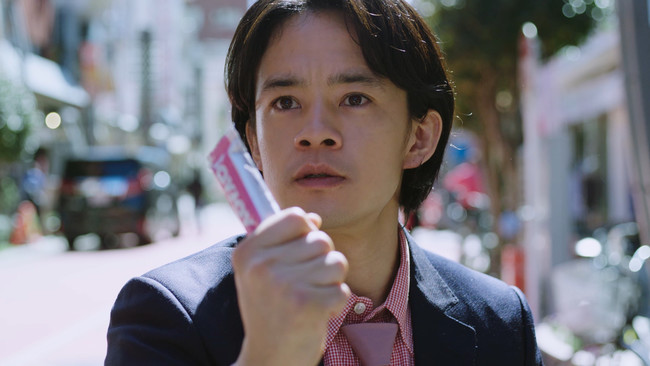 黒いスーツにピンクのシャツ姿で颯爽と自転車をこぐ池松さん。ふと良い匂いがしてフラフラと引き寄せられてしまいます。立ち止まったのは人気のシュークリーム店。ぐ~っとお腹がなってしまいますが、内ポケットからSOYJOY ストロベリーを取り出すと「こんな時こそ食べてもいい!いやむしろ!」と熱く語り、近くの公園に立ち寄ってSOYJOYを食べ始めます。