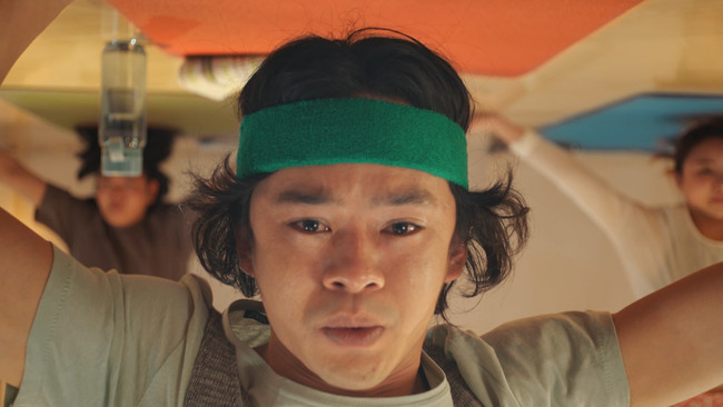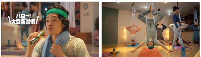 「運動、からの、大豆バー。」篇では、池松さんがエアリアルヨガ(Aerial Yoga)というハンモックを使ったヨガに挑戦。撮影前にはインストラクターからエアリアルヨガのポーズを指導され、初めての体験に緊張した面持ちでした。ハンモックの上に座る際バランスをとることが難しく、スタッフやインストラクターが心配そうに見守る中、池松さんは持ち前のバランス感覚の良さと運動神経を活かし、1発でポーズをとることに成功。周囲から拍手が起こり、本人もホッと安心した様子でした。ヨガシーンの後、全身全霊で筋トレに励むシュールかつコミカルな姿にもぜひご注目ください。