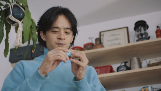 ふと目をやると、その中のSOYJOY ブルーベリーが池松さんにパチパチと瞬きをします。池松さんは「今日は君だ」と取り出して、SOYJOY ブルーベリーを食べながらつかの間の休憩を楽しみます。