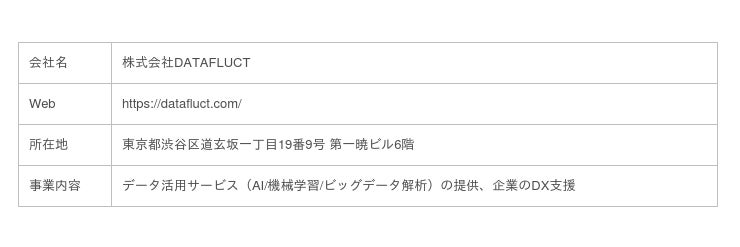 DATAFLUCTは、2019年の設立以来「データを商いに」というビジョンのもと、活用されていないデータから新たなビジネスを創出し、企業と社会に価値を生み出しつづけるデータサイエンス・スタートアップスタジオです。衛星画像データから位置情報やPOSデータまで幅広い分析実績をもち、技術やデータにかかわらず業界をこえたアルゴリズム構築を得意としています。