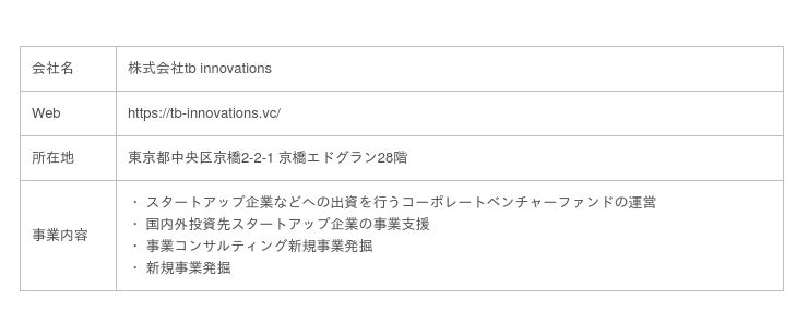 株式会社tb innovations 広報担当 Mail:tit_info@tb-innovations.vc