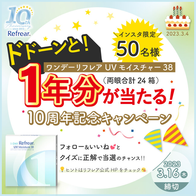 Refrear(リフレア)シリーズを展開しているコンタクトレンズメーカー「フロムアイズ株式会社(本社:東京都千代田区)」の公式Instagram【https://www.instagram.com/refrear_/】は、2023年3月4日より【ワンデーリフレアUVモイスチャー38】の誕生10周年を記念して、フォロー&リフレアにまつわるクイズに全問正解した方の中から、抽選で50名様に当製品1年分(24箱/左右セット)をプレゼントいたします。