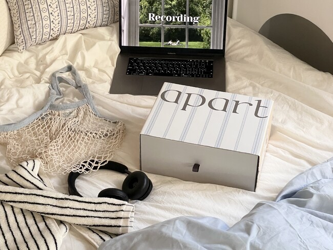 「apart」は、3ヶ月に一度、季節のテーマに合わせた暮らしを彩るアイテムをお届けするサブスクリプションサービスです。箱の中には、インテリア雑貨3点に加え、化粧品や食品を含むライフスタイル雑貨を7点以上詰め合わせています。ボックスが届いたら、同封されたマガジンを読んだり、専用プレイリストを聴いたりしながら自分へのご褒美としてたくさんのアイテムを楽しむことができます。