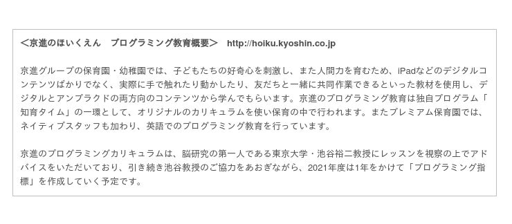 英語とプログラミングは世界の共通言語であり、英語を理解し話そうとする意識と論理的に考えようとする意識を、共に育て伸ばしていくため、今後はタブレットを使って作ったプログラミング作品のプレゼンテーションなどのレッスンを予定しています。また、プログラミングカリキュラムにアドバイスをいただいている脳科学の第一人者・東京大学の池谷裕二教授のご協力のもと、今後「プログラミング指標」についても作成してまいります。