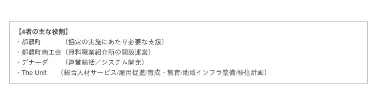 株式会社The Unit(本社:東京都渋谷区、代表取締役:宮内 智教、以下「The Unit」)は、都農町(所在地:宮崎県児湯郡都農町、町長:河野 正和)と都農町商工会(所在地:宮崎県児湯郡都農町、会長:河野 寛利)、株式会社デナーダ(本社:宮崎県児湯郡都農町、代表取締役:佐々木 大樹、以下「デナーダ」)の3者と、都農町が抱える雇用の創出や人材確保等の課題解決に関する4者間協定を締結いたしました。