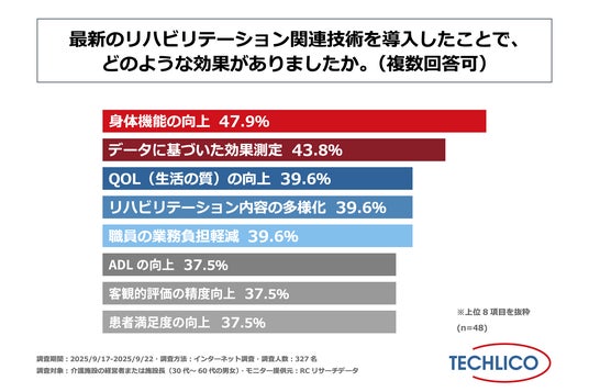 次に、最新のリハビリテーション関連技術を導入していると回答した人を対象に「最新のリハビリテーション関連技術を導入したことで、どのような効果があった」を尋ねる設問への回答では、1位が「身体機能の向上」で47.9%、2位が「データに基づいた効果測定」で43.8%という結果になりました。この結果から、最新のリハビリテーション関連技術を導入した介護施設で得られた効果は主に、「身体機能の向上」や「データに基づいた効果測定」であることがわかりました。