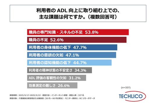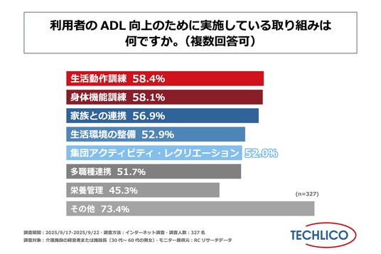 株式会社テクリコ(本社:大阪府大阪市、代表取締役:杉山 崇)の「リハまる」開発部門は、介護施設の経営者または施設長(30代~60代の男女)を対象に「介護現場におけるADL向上リハビリテーションに関する調査」を実施しました。この調査から、介護現場における利用者のADL(日常生活動作)向上のための取り組み状況や最新のリハビリテーション関連技術の導入状況などが明らかになりました。