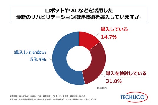 また、「ロボットやAIなどを活用した最新のリハビリテーション関連技術を導入しているか」を尋ねる設問への回答では、1位が「導入していない」で53.5%、2位が「導入を検討している」で31.8%、3位が「導入している」で14.7%という結果になりました。2位と3位の回答を合計すると回答率45%を超える形となり、この結果から、介護施設の経営者または施設長の45%以上が、ロボットやAIなどを活用した最新のリハビリテーション関連技術の導入を検討している、または導入していることが明らかになりました。