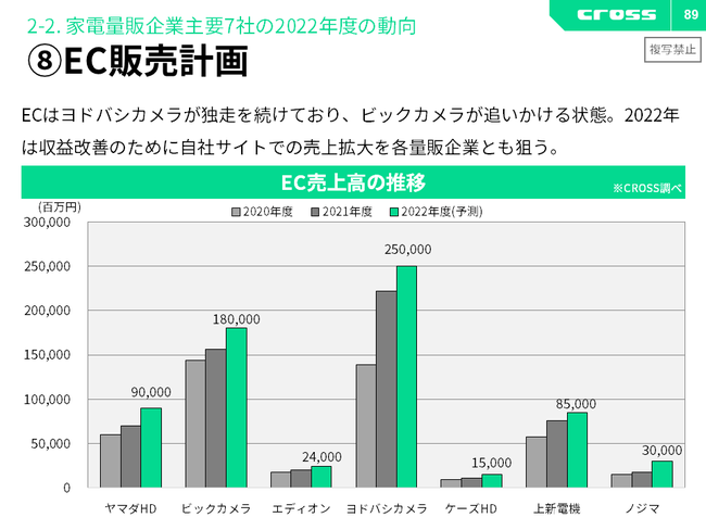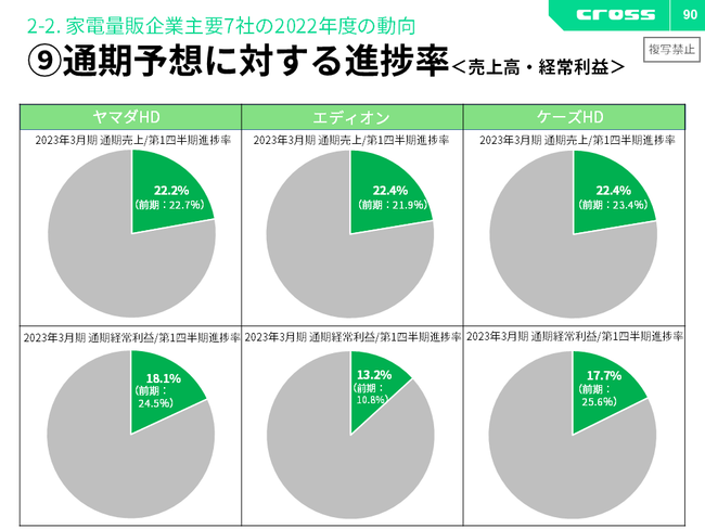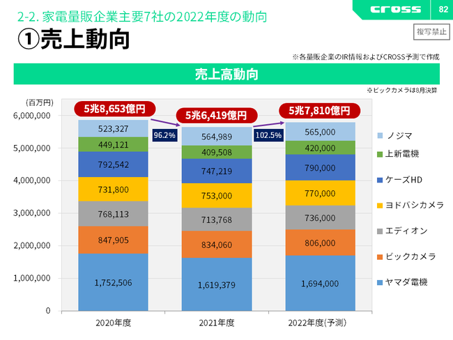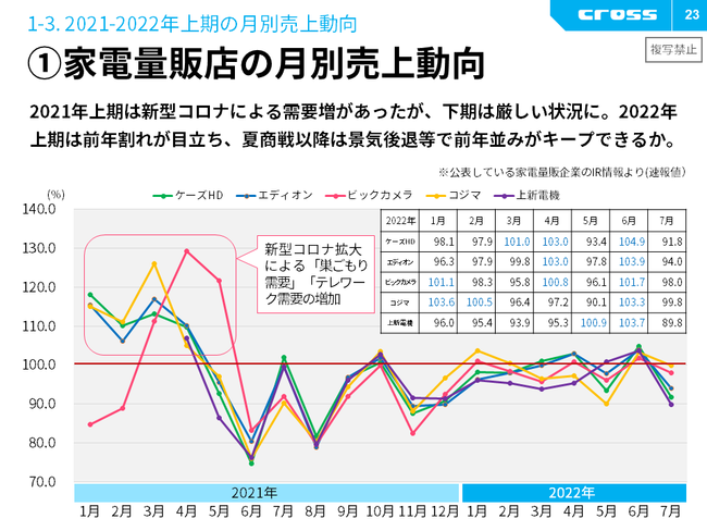 2022年度の第1四半期前半はテレビやパソコン等のデジタル商品の不調、好調だった調理関連商品の落ち込み等があり厳しい状況が続きましたが、6月に一気に猛暑となり、エアコンに助けられ前年並みをキープ。しかし、第2四半期以降は季節商品を除くと家電市場は厳しくなると予測されます。このような中でパナソニックは指定売価制度(メーカー指定価格)を導入し、新しい取引基準を始めました。家電量販企業は成長しているEC分野やリフォーム分野、玩具・ゲーム分野を強化するとともに、出店を強化しています。