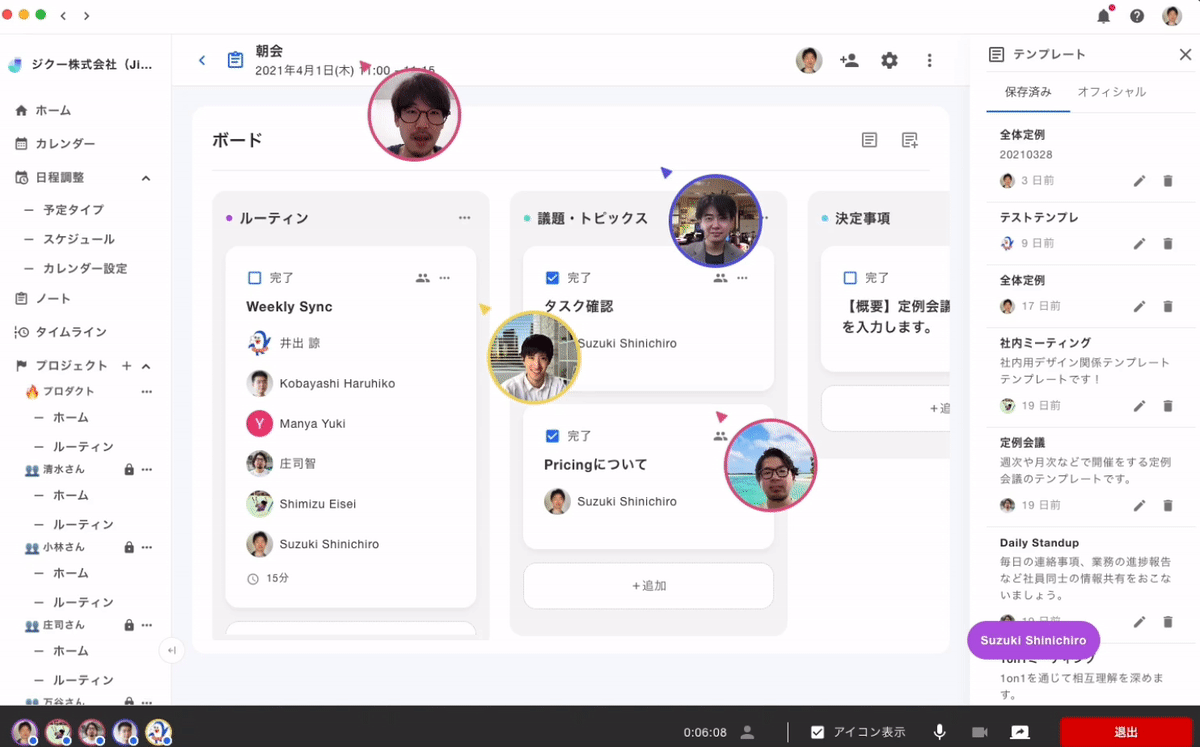 朝会、定例のアジェンダや議事録ノートは自動で作成しリマインドも行います。