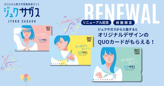 リニューアルを記念しまして、オリジナルデザインのQUOカードを枚数限定でご用意いたしました。リニューアルサイト公開日以降にジュクサガス経由で対象の塾へ入塾された方には、オリジナルデザインのQUOカードを入塾特典として進呈させていただきます。枚数に限りがございますのでなくなり次第終了となります。ご希望の方はお早めにご入塾ください。