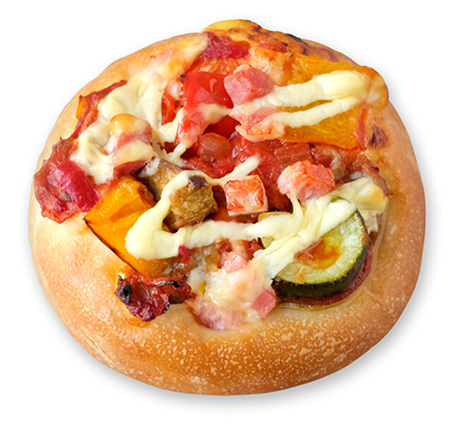 北海道産小麦を使用したほんの少し塩味のあるソフトフランス生地を使用し、ベーコンとグリル野菜(ズッキーニ・トマト・赤ピーマン・ 黄ピーマン・なす)をのせ、ラタトゥイユ風に味付けし焼き上げました。これも、発酵のタイミングを見極めて具材を乗せる技術が必要です。