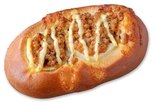 具材と一緒に食べておいしいことを追求し、料理パンながら甘めのふんわり生地を使用しました。シャキシャキ食感の蓮根とバジルで炒めたタイの定番料理「ガパオ」フィリングをトッピングし、 マヨネーズで仕上げました。ピリッとスパイシーなガパオが食欲をそそります。シャキシャキ食感の蓮根とバジルで炒めたタイの定番料理「ガパオ」フィリングをトッピングし、 マヨネーズで仕上げました。ピリッとスパイシーなガパオが食欲をそそります。料理パンは、最終発酵したパン生地に具材を乗せていきます。パン生地がへたらないよう、発酵のちょうどいいタイミングを見極めて、具材を手早く丁寧に確実に乗せる技術が必要です。4名ほどで毎日300~400個製造します。