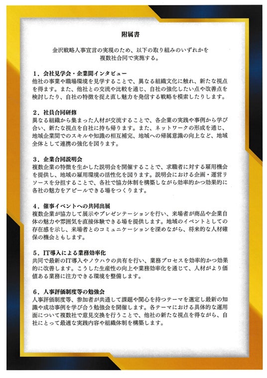 企業間で協力し、地域の未来をつくる人材の採用・育成・定着に戦略的に取り組むことに賛同いただいた会員企業については、より包括的な宣言に署名いただく予定です。2024年2月に締結を予定しています。
