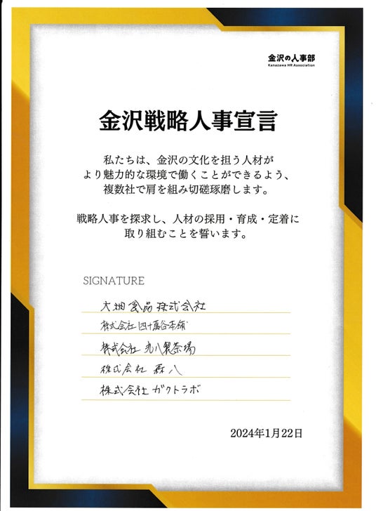 金沢の文化を担う人材がより魅力的な環境で働くことができるよう、複数社で協力し切磋琢磨すること。戦略人事を探究し、人材の採用・育成・定着に取り組むことを誓う「金沢戦略人事宣言」を2024年1月22日締結
