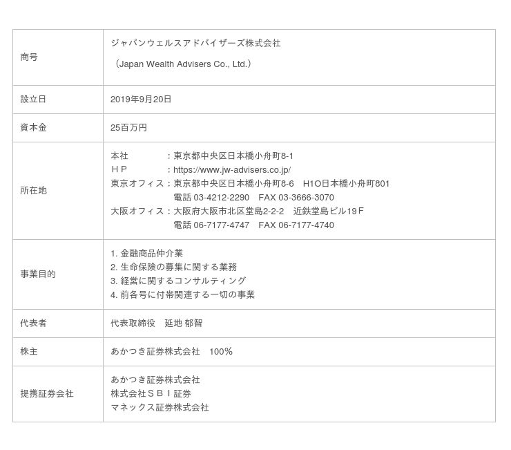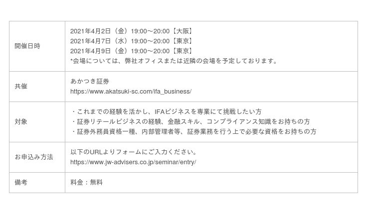 ジャパンウェルスアドバイザーズ株式会社(東京都中央区、代表取締役:延地郁智、以下JWA)は、あかつき証券株式会社(東京都中央区、代表取締役:工藤英人、以下あかつき証券)との共催にてIFAとして独立を検討されている方へ無料説明会を開催いたします。
