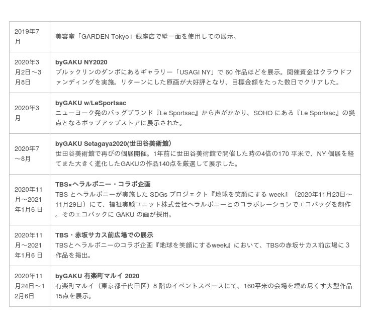 16歳の時にある日突然、絵を描き始める。そこから驚くべきスピードで絵を描き続け、たった4年でNYでの個展を成功させる。彼の作品に魅了され、商業施設マルイや、ニューヨーク発のアパレルブランド 『Le Sportsac』からも声がかかるなど、今、もっとも注目されている若手アーティスト。GAKUは、言語を介したコミュニケーションが得意ではないため、五感で感じ取った全ての想いを、作品を通じて伝えている。そんな GAKUの作品は、人々にポジティブな感情や力強いエネルギーを与えてくれる。