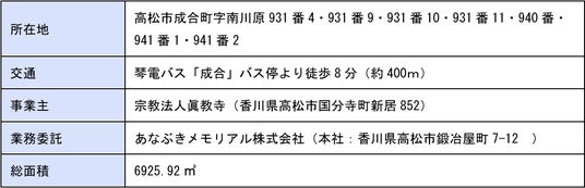 穴吹興産株式会社(本社:香川県高松市鍛冶屋町7番地12、代表取締役 穴吹 忠嗣)は、100%子会社である あなぶきメモリアル株式会社(本社:香川県高松市鍛冶屋町7番地12、代表取締役 近藤 陽介)において、当社グループ初の霊園事業となる「アルファメモリアルパーク高松」プロジェクトが始動しますので、お知らせいたします。