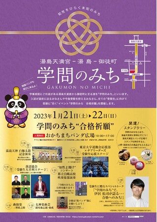 地元商店街である、白梅商店会と御徒町駅南口商店会では、入試が直前に迫るみなさんや、今後受験を控えるみなさん、全ての「受験生」に向けてエールを贈るべく、『学問のみち”合格祈願“』をJR御徒町駅南口改札を出てすぐの「おかちまちパンダ広場」特設ステージにて1/21(土)、1/22(日)の2日間開催します。東大卒でクイズプレーヤーで知られる、伊沢拓司さんによる受験生に贈るスペシャルトークステージ(1/22日開催)や東京大学運動会応援部×チアリーダーズによる受験生応援ステージをはじめ、地元湯島の白梅太鼓や落語協会ステージなど盛りだくさんの内容となっております。是非、イベントにお越しいただき、『学問のみち』を通って湯島天満宮にご参拝ください。