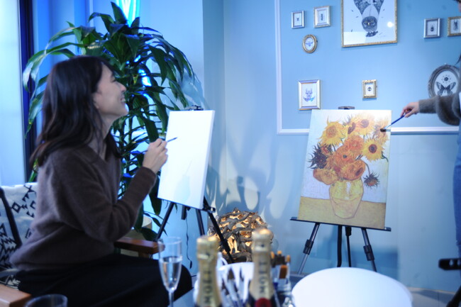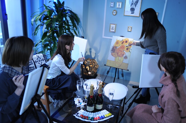 外国人講師らによるお子様でもわかる指導で、ピカソ・モネ・ゴッホといった有名作家の絵を描きながら、こだわりのワイン、カフェやおつまみと一緒におしゃべりが楽しめる体験型アート系ワークショップ
