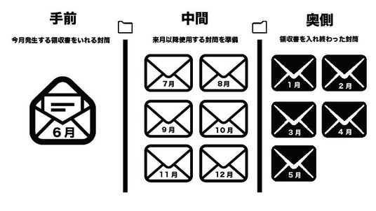 更に、安価に文具店等でも手に入る「長3封筒(別売り)」をご用意いただき、「使用した月」や「勘定科目」を予め記入してセットしておけば、あとは領収書を封筒に入れておくだけ。