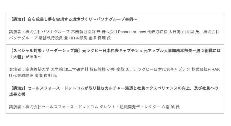 講演では、パソナグループやセールスフォース・ドットコム社における人材育成カリキュラムの具体例や、社員のエンゲージメント促進の最新事例が紹介され、「社会変化への対応」や「ハイブリッド・キャリア」、「カルチャー+テクノロジー+データ=エンゲージメント」、「タレント・エクスペリエンス」などのキーワードが上りました。参加者からは「具体的施策と効果、仕組みが丁寧に述べられ、非常に勉強になった」との感想がありました。