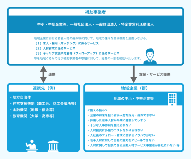 本事業は、民間事業者等が複数の地域企業を束ね、地方自治体、業界団体、経営支援機関等とも連携し、地域ぐるみで若者人材に向けた仕事やキャリアステップを作り、求人・採用(マッチング)、人材育成、キャリア支援・定着(フォローアップ)等を行う総合的な取組を支援します。