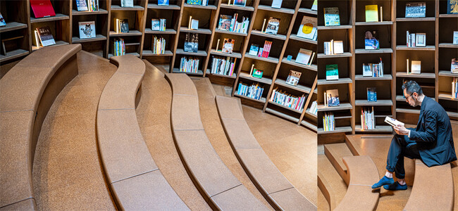 その地中図書館の本棚の間を抜けると天井から優しい光が差し込むホールが現れ、ドーム状の壁一面には本がびっしりと並んでいる景色は圧巻です。この読み聞かせのためのホール内、ベンチや階段でTOKYO CORK PROJECTの再生コルク素材を使っていただきました。また安全性のため書棚のコーナーガードとしても使っていただいています。コルクは天然素材で、断熱・遮音・防水・弾力・軽量・絶縁性など多くの機能特性があります。