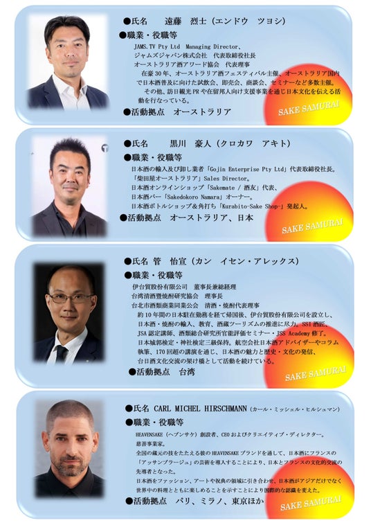 現在までに105人の方々を「酒サムライ」に叙任しており、本年は、外国の方を含む4人の方々を令和7年10月9日(木)11時よりに京都・松尾大社において「酒サムライ」として叙任することとなりましたのでご紹介させていただきます。